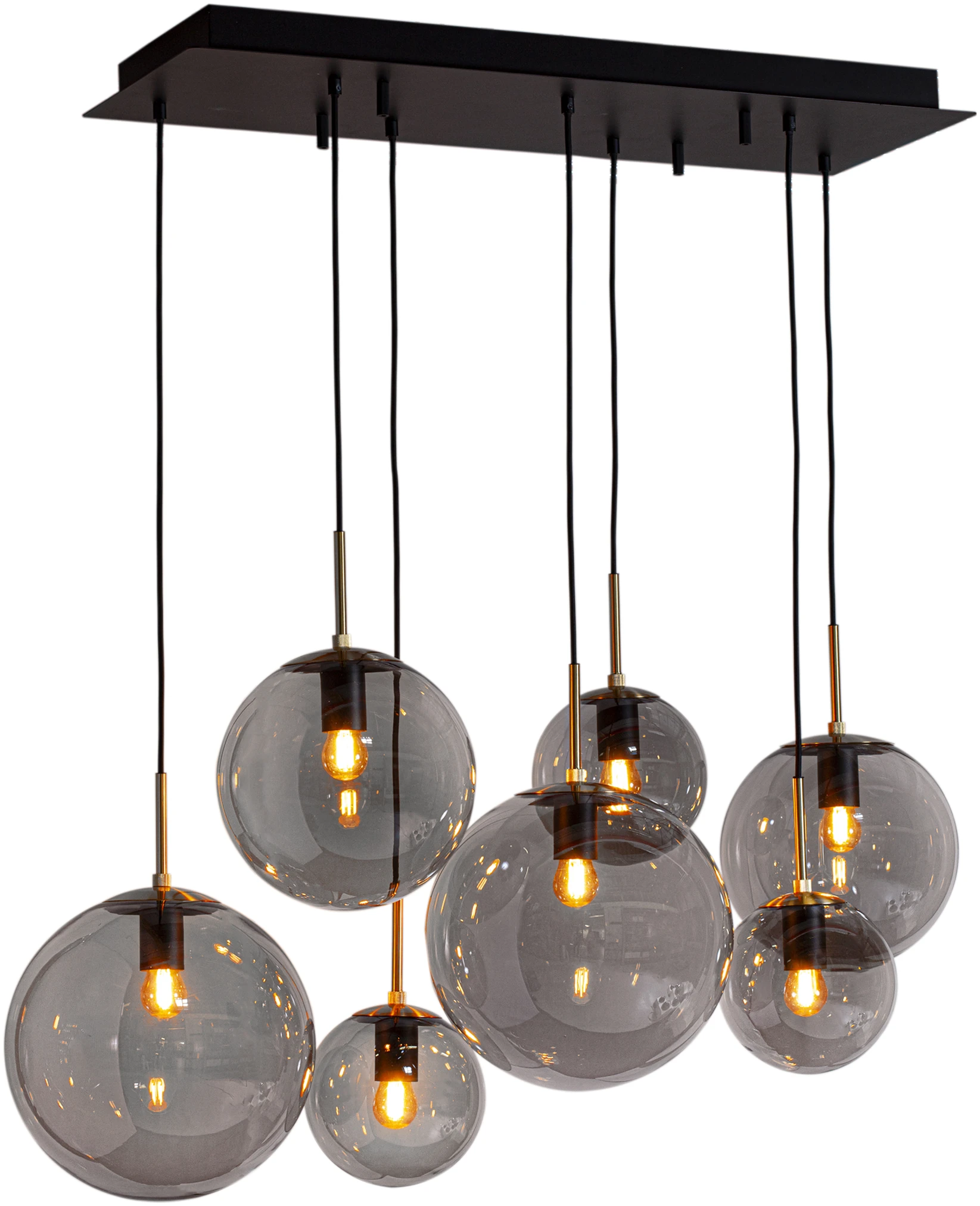 Sort, matt metall, messingdetaljer og røkfarget glass.